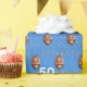 Custom funny face cut-out photo wrapping paper for a 50th birthday party. Design with confetti, a blue background, and a happy birthday message. To change the colour please click the button to edit the design. To make the cut-out of the photo you can download any free mobile app, or use Canva, or Photoshop and upload a transparent png file.