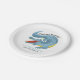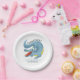 Cute alligator theme birthday party paper plate featuring an illustration of a blue crocodile with a party hat with the hand lettered text "Chomp, chomp" Perfect for a boy's party in the summer.