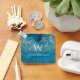 An elegant modern design. On a blue geode background with many nuances of blue, there is a big white monogram initial, with the name under it, also in white caps.