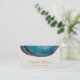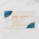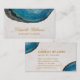 There is a blue agate geode on the upper half on the front and two blue geodes in the corners on the back. The background is white marble. All text is golden an is written in caps, except the name, on the front, written in an elegant calligraphic script. The blue geode is from a photo by Robert Ramsay from Pixabay and it is free for commercial use.
