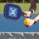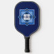 This pickle ball paddle has a contemporary geometric design, in shades of blue. The front design is made up, of blue squares that overlap each other. In the centre there is an area for a monogram. On the back of the paddle there is a repeating patter of the design on the front.