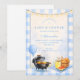 A fresh summer Baby-Q design featuring soft blue gingham, warm string lights, and a charming watercolor grill scene. A blue balloon, fresh lemonade, watermelon slices, and picnic basket details create a light and cheerful backyard atmosphere. The structured inner frame keeps the center clean and airy for event wording, while the illustrated cookout scene anchors the bottom with playful charm. Perfect for a spring or summer outdoor baby shower with a sweet picnic vibe.