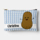 Adorable toiletry bag featuring a cute happy cartoon brown potato. The background is a cute classic pattern of blue and white gingham. A template to add your name to personalise.