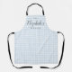 Custom kitchen apron feature classic light blue gingham check with personalized name and text. Great personalized hostess cooking aprons for her.