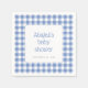 A classic blue gingham check pattern frames a white rectangle with rounded corners and a thin blue border, with the name of the mother-to-be and the words "baby shower" in charming blue typography. Add the date below in grey sans serif font. Ideal for a boy's baby shower.