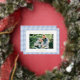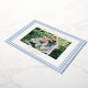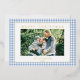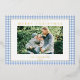 Create your own custom photo Christmas cards featuring one of your favourite family pictures alongside personalised minimalist typography family name and year on a cute blue gingham plaid pattern background.