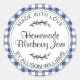 Blue gingham homemade blueberry jam round sticker featuring black hand-drawn script and simple botanical accents on a white centre. The classic round format and soft blue check create a warm, rustic impression that pairs beautifully with jars, baked goods, and homemade gifts. Easily personalise with your details.