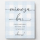 This blue gingham boy baby shower mimosa bar sign is perfect for a simple baby shower. The modern design features a timeless blue gingham design and modern fonts. The script text heading is an image that cannot be edited. The heading image can be resized to fit any poster size. All of the other text is fully editable. For more advanced customisation of this design, simply select the "Customise It" button above.