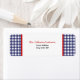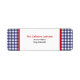 An address label featuring a blue gingham background with red trim. Personalise with your name and address. Look for matching baby shower invites and more at Jill's Paperie.