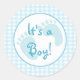 Round sticker with an image of baby blue gingham and blue baby feet in a white circle with a blue border. Optional text. See matching wrapping paper. See the entire Kidz Korner Sticker collection under the CARDS & STICKERS category in the KIDZ KORNER section.