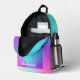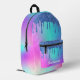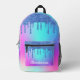 Blue glitter drip school backpack with cool fluorescent, neon pink, purple and light blue background. Personalise it by adding your name. Great birthday or Christmas gift for women and girls.