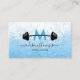 Modern fitness business cards featuring a blue marble & glitter background, a barbell weight silhouette, a signature script, and a professional text template that is easy to personalise. This would be perfect for a personal trainer who works in a gym, or for a self-employed health coach.