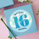 “Happy Sweet 16”. Celebrate her birthday with this stunning, simple, festive, modern, personalised round sticker. Bold, graphic, deep teal blue typography and white handwritten script overlay a teal blue glitter “16”, aqua green blue balloons and gold sparkly string lights on a soft light aqua blue background. Personalise the custom text with your daughter’s name. Great for the budding fashionista who loves modern glitter and glam and guaranteed to add stylish fun to her milestone party! Matching plates, napkins and other birthday goodies are also available in this trendy and special collection.