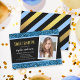 Blue Glitter Photo Birthday Party Invitation features the words "Sweet Sixteen" in a fun sans serif font in faux gold foil with a blue glitter top and bottom and a black centre background. Invitation has a blue, black and faux gold foil stripes pattern back side.
