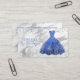Elegant dress seamstress business card, with graphics of a blue glitter dress, against a silver and white marbled looking background, with faux diamond accents. Personalise the text to suit your business needs. A lovely stand out card for your tailoring business.