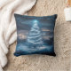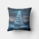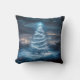 A glowing blue Christmas tree standing peacefully in a snowy landscape. Illuminated by soft winter lights and crowned with a radiant star, the tree shines against a dreamy night sky overlooking a quiet, glowing town below.