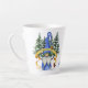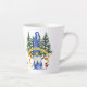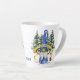 This fun Holiday latte mug has a funny little gnome holding a gold banner with green text that says "Happy Holidays!" He is dressed in blue, with a gold bell at the tip of his hat. Behind him are snow covered pine trees, and a little bird perches on the end of his long white beard. The image is printed on two sides, and your custom text is in matching blue at the centre between the images.