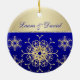 Remember your special day with this beautiful festive navy and royal blue with gold faux glitter (PRINTED) snowflakes round shaped ceramic first Christmas together keepsake ornament that can be customised with the names of the bride and groom, and the year. You can customise the text to say whatever you want and use them as a wedding favour at your winter or Christmas wedding, or as decorations for your venue centerpieces or decor. ****PLEASE be sure your text is placed where you want it, as it will print out as it appears on your monitor. Zazzle will NOT correct anything. It also matches the wedding invitation shown below. If you would like a different shape, or if you need any assistance, please email niteowlstudio@gmail.com.