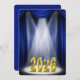 Gold 2025 text in the spotlight with blue stage curtain for graduation party invitation.