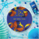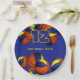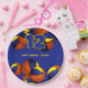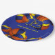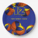 These basketball themed party paper plates are fully customisable and feature clusters of basketballs at the top and bottom edges - each of the basketballs has two recolored panels, one blue and one gold - personalise with your custom text - by katz_d_zynes