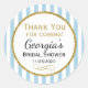 Elegant bridal shower stickers featuring light blue and white stripes with sophisticated gold glitter accent frame. These fashionable and stylish bridal shower favour tags stickers will be a hit for any wedding shower party! They say "Thank you for coming" with the bride's name and date.