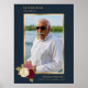 Elegant blue and gold funeral photo welcome sign featuring alabaster, blush and burugndy roses.