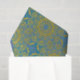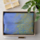 Vintage tissue paper design featuring a blue and gold distressed damask pattern on a canvas textured background.