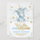 Cute winter-themed first birthday invitation featuring an adorable baby elephant, blue and gold snowflakes, faux glitter stars and confetti sprinkles
