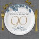 Blue Gold Floral Custom 90th Birthday Party Paper Plate