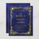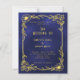For an elegant, Gatsby style wedding. A navy blue uneven coloured background decorated with a golden art deco style frame with flowers. Personalise and add your names and details.