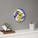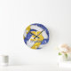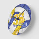 This team colours volleyball themed wall clock features the stylised, realistic image of a volleyball that has blue, gold and white panels with overlying clock face numerals - an artsy, floral kaleidoscopic pattern is blended with the volleyball's blue and gold panels - customise with the athlete's name in an autograph style font and jersey number in a varsity letter style font - by katz_d_zynes