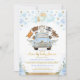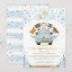 Beep, Honk, Shout and Wave! Invite your guests for a drive by baby shower with this adorable invitation featuring blue & gold hearts confetti, watercolor flowers and adorable woodland animals in a cute blue car