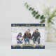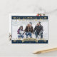 Elegant blue and gold botanical photo Happy New Year postcard featuring a blue photo frame adorned with holly, berries and falling snow on the front and a watercolor painting of poinsettia, holly and red berries at the back.
