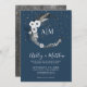 Boho Star Blue Gold Crescent Moon Celestial Monogram Wedding Invitation. Celebrate an evening under the stars with this enchanting boho celestial wedding theme. It offers an elegant yet playful look with a watercolor midnight sky crescent moon, gold stars, and white flowers, feathers, and other bohemian accents. The front features a deep blue, almost navy blue background, while the back showcases a dark starry night watercolor. The colour scheme includes black, white, gold, and grey. The design beautifully blends script typography with a serif font. Experience a mystical evening beneath this captivating crescent moon sky. Blue Gold Moon Celestial Wedding Invitation. Available as a printed invitation, or as a downloadable digital invite that you can send in e-mail or have printed locally!