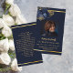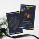 A dark blue background, a faux gold looking frame and space for your photo. Decorated with blue florals. Personalise and add name, dates and your text. Golden text.