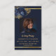A dark blue background, a faux gold looking frame and space for your photo. Decorated with blue florals. Personalise and add name, dates and your text. Golden text.