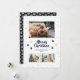 Modern blue and gold photo Meowy Christmas card featuring three photos, snow and paw prints on the front and a paw prints background at the back. Easily personalize this cute photo Christmas card with your photos, family name and the year.
