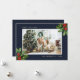 Elegant blue watercolor photo Christmas cards featuring a dark blue photo frame decorated with watercolor illustrations of holly with berries and faux gold foil confetti. Easily personalise these blue watercolor Christmas photo cards with your image and text.