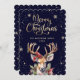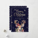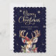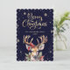 Blue and gold calligraphy Christmas card featuring a watercolor painting of a reindeer, holly, red berries and other winter botanicals on a dark blue background adorned by snowflakes.
