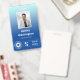 Vertical office employee badge with a simple design against a gradient from pale blue to sky blue. Add a photo of the employee along with name and profession. Personalise further with two business logos.