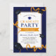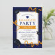 This graduation party invitation features bluish black graduation hats with orange tassels and ribbons, and a blue detailed background. Personalise your own image and text.