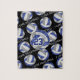 This volleyball pattern jigsaw puzzle for girls features a larger blue, gray and white artsy, stylized volleyball, upon which her name and jersey number can be personalized, overlying a pattern of smaller blue, gray and white volleyballs on a black background and "I love volleyball" varsity-letter-style text in gray stretching between the angled rows of volleyballs - by katz_d_zynes