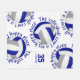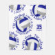 This cool volleyball themed fleece blanket features 5 randomly arranged blue, gray and white volleyballs with the text, "The volleyball court is my happy place" in blue encircling each volleyball in a cool typographic font, all on a white background - her name and jersey number are customizable - by katz_d_zynes