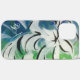 Large abstract white flowers on blue and green brushstroke background. Great summer colours, home decor colour choice, greeting cards and more.