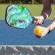 Modern pour painting marble effect blue, lime green and black abstract art pickleball paddle.