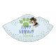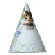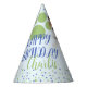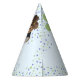 Cute beagle puppy dog in a hat on a kids birthday party hat! This design has a very cute dog on it, this dog is a tricolor black, brown and white beagle puppy with the kawaii beagle ears flopping down. This beagle dog is wearing a hat, it's a brown hat in a cowboy style. This pattern also features a large pawprint in green. There are blue and green spots and dots around the design for a festive look, against a pale light blue. The text "Happy Birthday" is in a dark blue. There is an opportunity to customise some text on it. and put in the name of the child who is celebrating this birthday.
