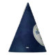 A watercolor blue party hat with the personalizable words that read "Happy Birthday" and your child's name. A watercolor navy and green dinosaur also adorns this cute birthday hat.