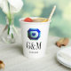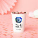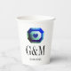 Blue green emerald gemstone custom wedding Paper Cups for wedding. Glamourous jewel with heart icon. Personalise with name initials of bride and groom plus date of marriage. Elegant typography design for couple getting married. Great for romantic dinner party, BBQ, reception, anniversary and more. Luxury party supplies for fancy event.