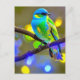A colourful fantasy bird sitting in a tree with blue and yellow bokeh lights in the background