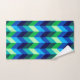 A hand towel featuring a colourful, ombre pattern design of chevrons in lime green, royal turquoise, ocean blue and sky blue.